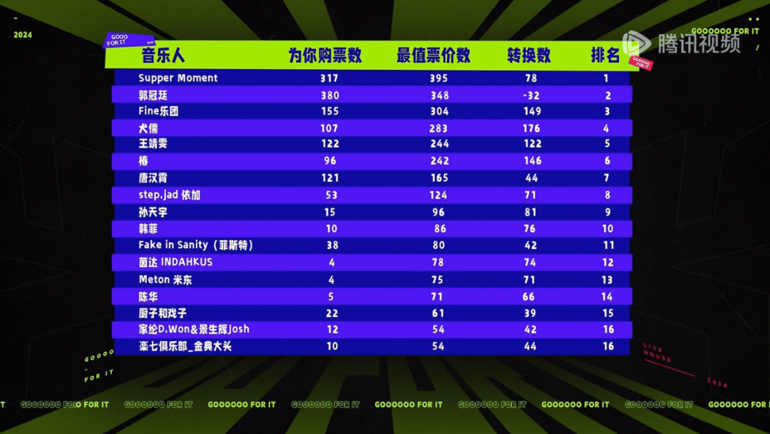 演出未开始前,节目组就统计了各个音乐人的“为你购票数”,能卖票,说明音乐人的作品有商业价值,有市场号召力,而演出结束后,节目组则会统计“最值票价数”,两者中间的转换数就是真正的“吸粉数”,也是竞争的衡量标准。