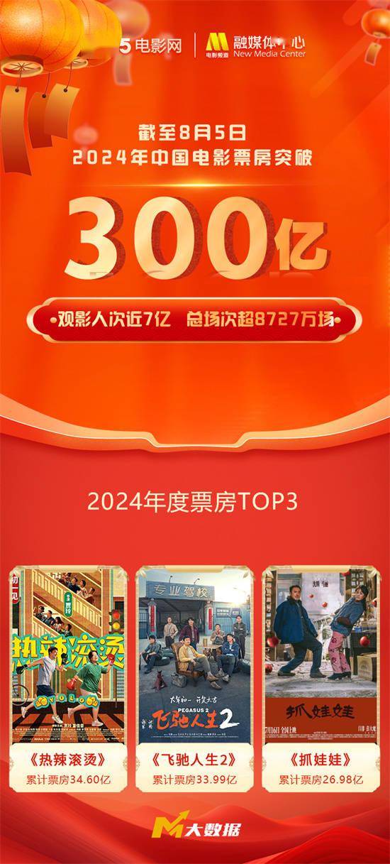 1905电影网专稿票务平台数据显示,截至8月5日,2024年中国电影年度票房突破300亿大关(含预售),观影人次近7亿,《热辣滚烫》《飞驰人生2》《抓娃娃》暂居年度票房前三甲。