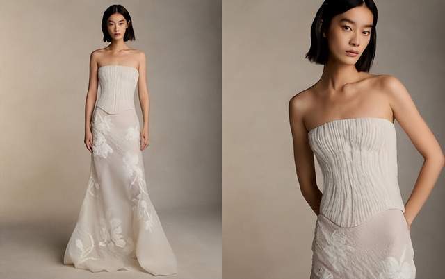 以品味著称的申敏儿,在雪地婚纱照中选择了来自纽约品牌 Danielle Frankel 的两件式造型──以极简线条打造的平口马甲搭配透明感长裙。 马甲的皱褶布面仿佛自然雕塑般贴合身形,勾勒出优雅、干净的上半身轮廓; 下身则以轻薄半透材质铺陈立体花卉,让整体造型在光影中呈现柔和的流动感。 这套 Look 既现代又浪漫,成功诠释她一向擅长的高级不做作气质,也让婚纱照散发犹如艺术作品般的纯净氛围。