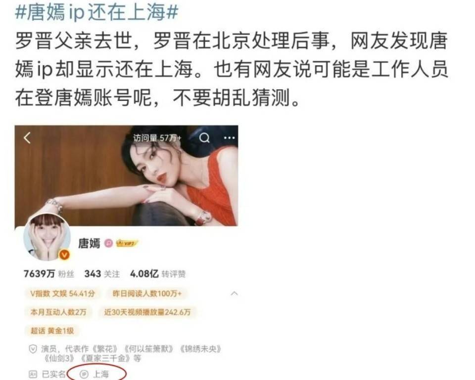 随后就有人发现,在罗晋父亲去世的消息曝光之后,唐嫣社交账号显示的IP地址仍然在上海。