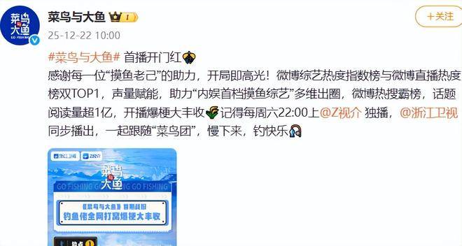 2025年12月22日上午10:00,浙江卫视宣布《菜鸟与大鱼》节目开播,并且取得了不小的成绩。该节目的首播迎来了众多关注,凭借着精彩的内容和高热度,迅速登上了微博综艺热度指数榜和微博直播热度榜的双榜单榜首,成为话题焦点。节目一经开播,便吸引了大量网友关注,微博热搜频频出现,话题阅读量突破了1亿大关。浙江卫视还表示,《菜鸟与大鱼》每周六晚上22:00都会准时在@Z视介 独家播出,同时@浙江卫视也会同步播出,邀请大家和菜鸟团一起放慢脚步,享受钓鱼带来的快乐。