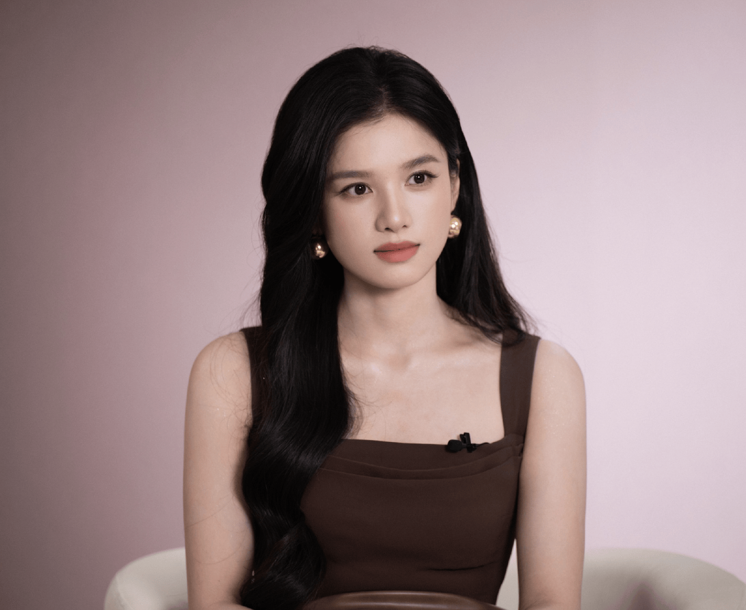 张婧仪身着棕调吊带裙,长发自然垂落肩头。