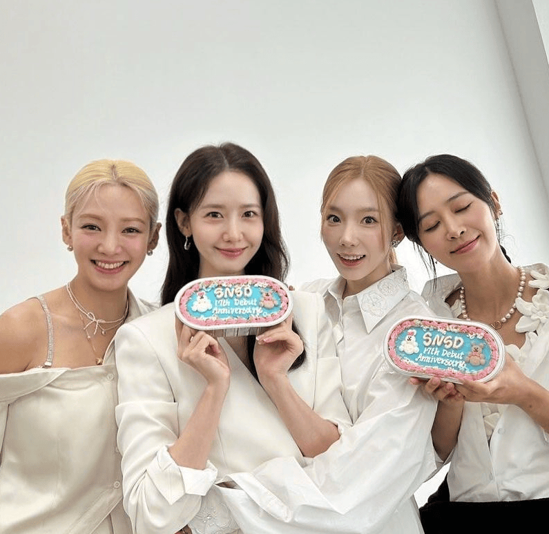 今天是少女时代出道17周年,泰妍、孝渊、Tiffany、Yuri、秀英、允儿、徐贤分享合照庆祝,白色主题穿搭漂亮清纯,姐姐们还把sunny(李顺圭)P上去了,永远的少女时代!是谁的青春我不说?