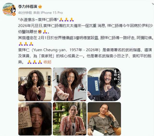 据李力持透露,袁祥仁是1号中午在香港伊利沙伯医院去世的,追悼会则定在2月1号,地点位于世界殡仪馆3楼。