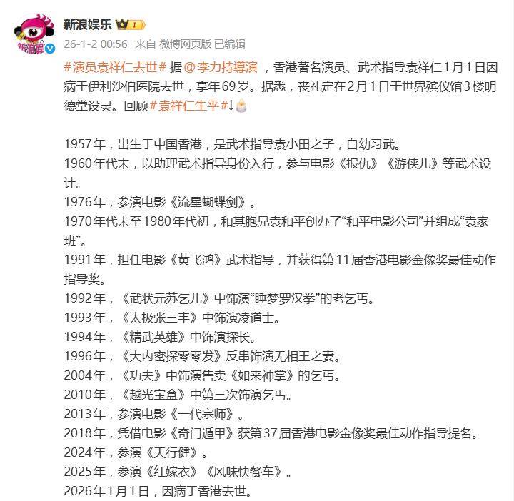 2026年元旦,一则消息让影迷心头一紧:香港著名演员、武术指导袁祥仁因病于伊利沙伯医院去世,享年69岁。其丧礼定于2月1日在世界殡仪馆设灵。这位在台前幕后都留下浓墨重彩一笔的“黄金配角”的离去,瞬间点燃了网络时代的集体记忆。