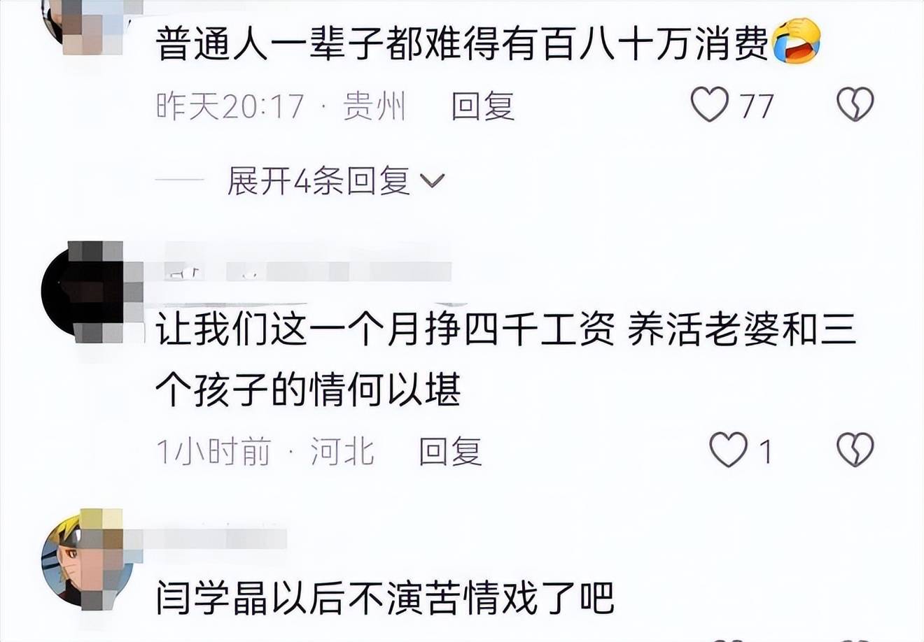 公众人物口碑的崩塌往往就在一瞬间,53岁演员闫学晶最近在直播里说儿子在北京“一年拍一部挣几十万不够花”,紧接着她还说,在北京养家,“没有百八十万,这个家根本转不动”,这样的凡尔赛言论直接引起了网友的批评,有网友回怼:“普通人大几千的人该怎么活?”