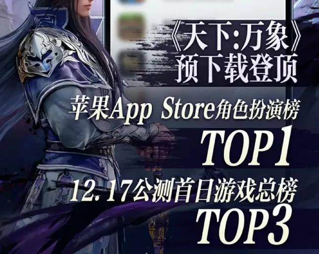 而在12月16日,当三端互通,将《天下贰》《天下3》以及诸多赛事服重新整合升级的全新游戏《天下:万象》正式开放预下载后,也迅速登顶了苹果APP Store角色扮演游戏榜榜首的位置;另外在公测当天,也成功登上了免费游戏总榜Top3。