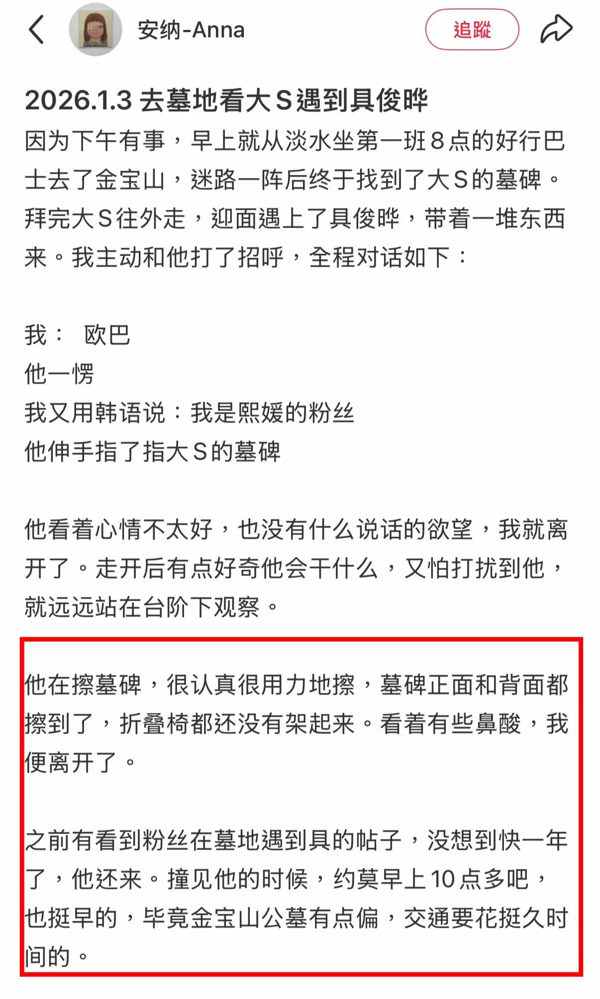 大S的粉丝偶遇了具俊晔,在金宝山。遇到具俊晔来陪伴大S,具俊晔可能还是很悲伤,没有交流的欲望,粉丝没有及时离开,而是在暗处观察具俊晔。