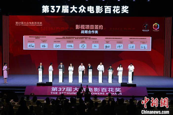8月4日,第37届大众电影百花奖颁奖典礼系列活动科幻论坛暨成都电影产业专场推介会在成都举行。此次论坛围绕这一主题,汇聚了多位科幻领域的知名专家,探讨中国科幻电影的独特特点及未来发展。论坛上还举行了影视项目签约仪式及蓉城电影龙门阵对话环节。图为论坛上影视项目签约仪式现场。 中新社记者 安源 摄