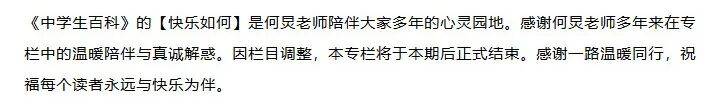 2025年12月26日,“中学生百科杂志”公众号宣布何炅专栏停止更新:感谢何炅老师多年来在专栏中的温暖陪伴与真诚解惑。因栏目调整,本专栏将于本期后正式结束。感谢一路温暖同行,祝福每个读者永远与快乐为伴。