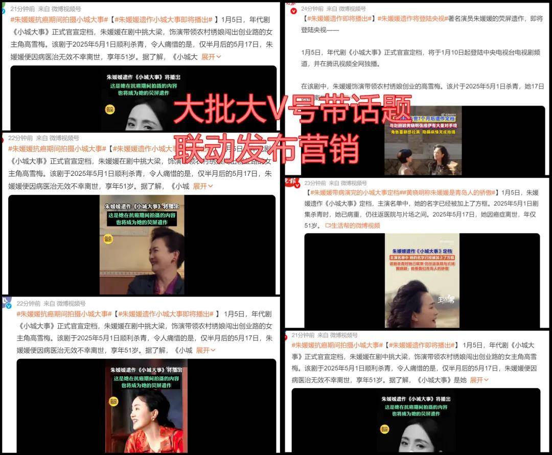 目前“朱媛媛遗作即将播出”相关话题已经出现在了热搜榜单之上,多个大V带着相同的热搜话题和几乎一致的文案发博宣传,颇有种大规模营销的感觉,给人的观感极为糟糕,整个宣传已然翻车了。