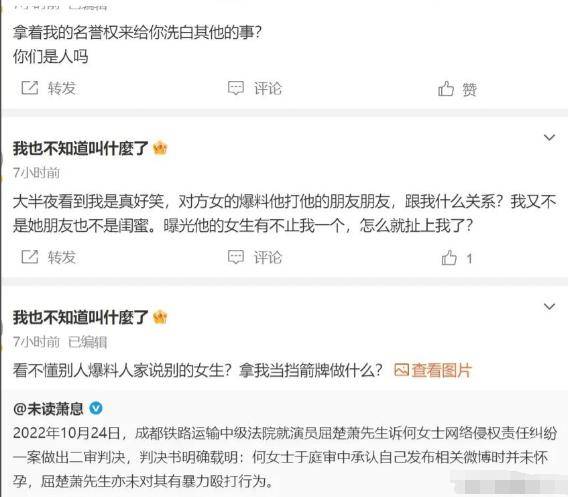 但没想到名誉权败诉的前女友暴起,直接出来怒骂屈楚萧拿自己当挡箭牌,自己是没被屈楚萧家暴,但被他叫来的人揍了,司晓迪爆料被打的女生不是她,是当年爆料屈楚萧有特殊癖好、PUA的那一个。