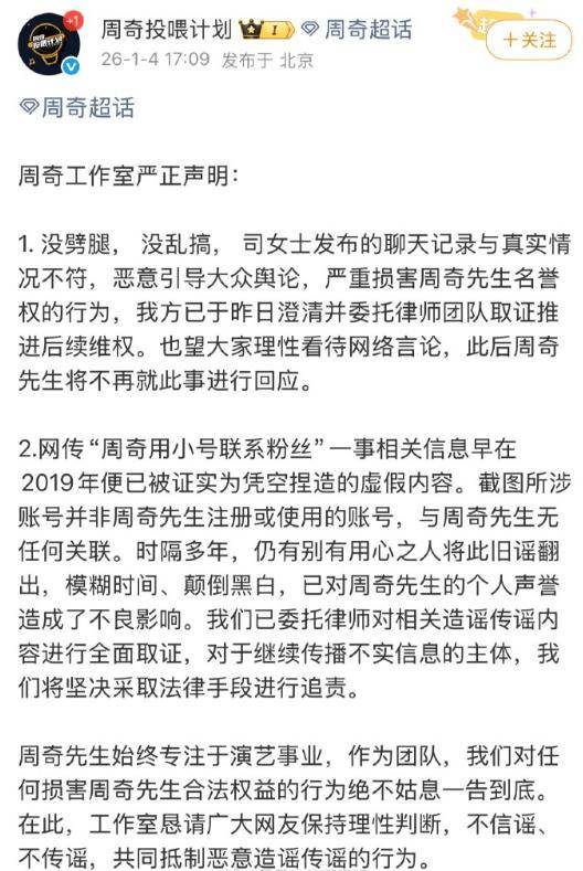 周奇一脚踏两船是实锤了,但还是意思意思发了个声明,默认了跟向涵之的恋情,不承认劈腿司晓迪。