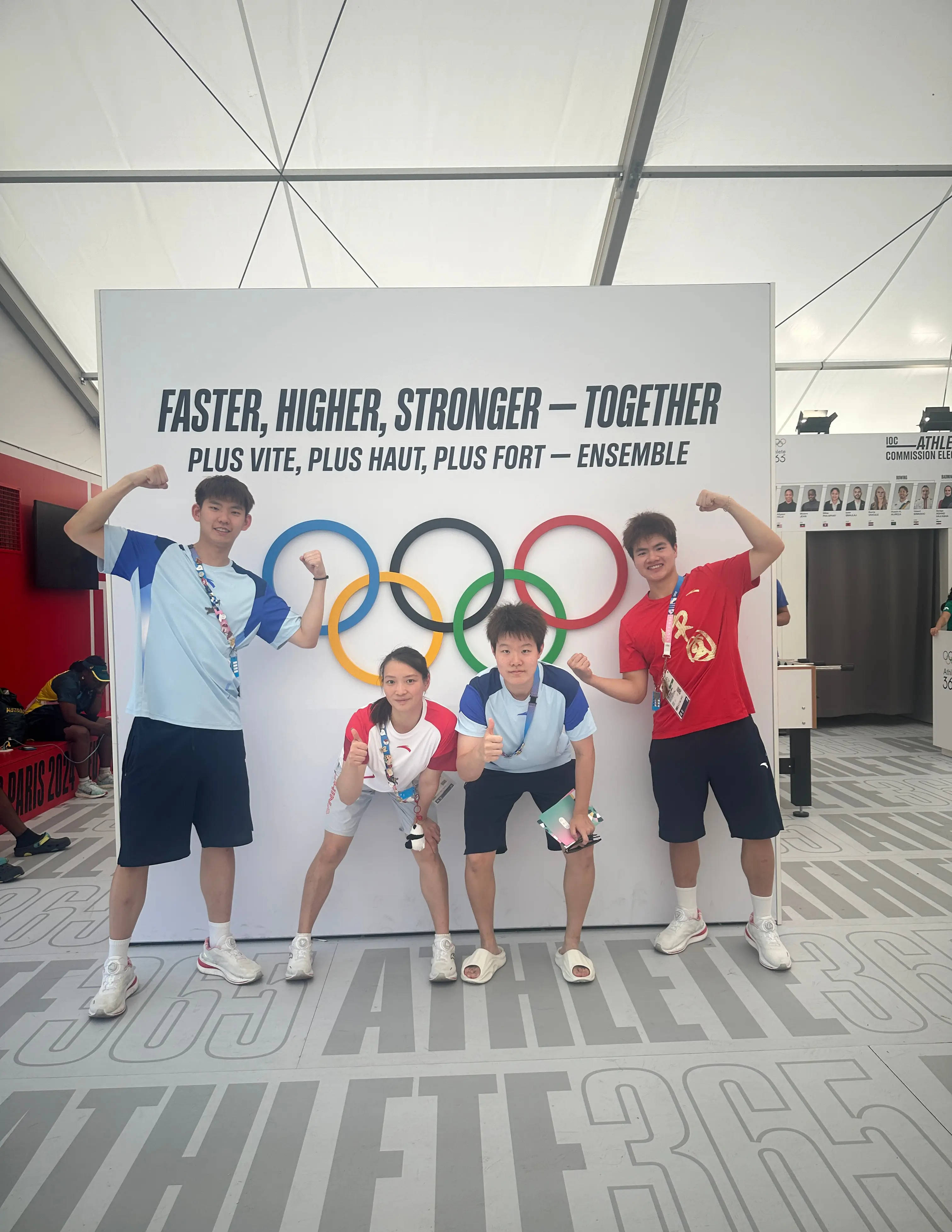 黄雅琼、刘雨辰、刘圣书、梁伟铿在奥运五环前合照。