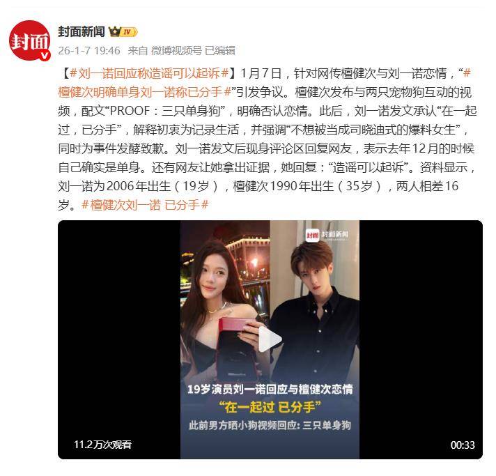 此外,两人16岁的年龄差(檀健次1990年生,刘一诺2006年生)也成为焦点。尽管刘一诺反复强调恋爱时“已成年”,但由于未提供交往起始的具体时间,这一声明并未完全平息外界关于其成年节点与恋情时间是否完全吻合的疑问。