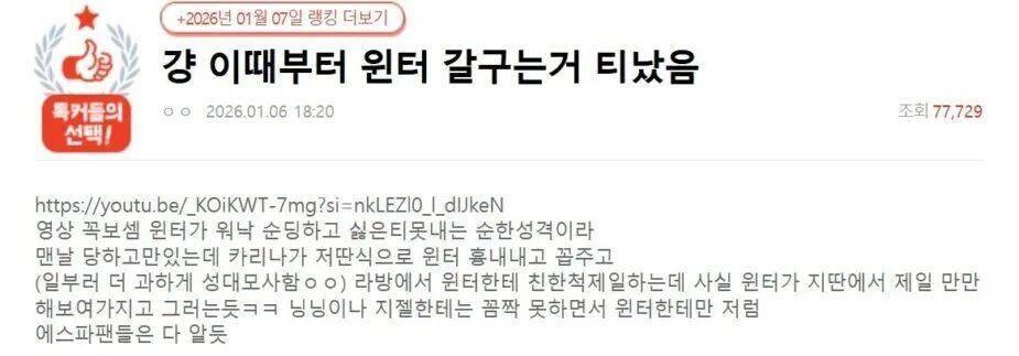 引发争议的视频片段其实并不复杂:画面中,Karina以略显夸张的方式模仿了Winter的语气和神态,整个过程带有明显的嬉闹色彩。然而,在这篇获得大量点击的Pann热帖作者眼中,这绝非简单的玩笑。发帖人言辞激烈地指出,Winter性格温柔隐忍,即使不舒服也不会表现出来,而Karina正是利用这一点进行“隐晦的嘲讽”。帖子更将矛头指向了两人关系的本质,声称Karina只敢对“最好欺负”的Winter这样做,而不敢对宁艺卓或Giselle如此,并断言“任何aespa粉丝大概都清楚这点”。