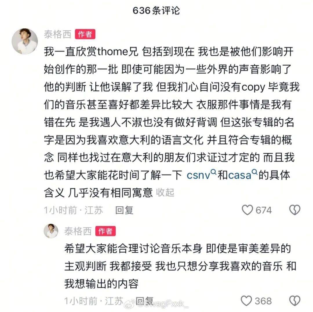 同时,泰格西还在评论区回应被骂抄袭偷米,希望大家合理讨论音乐本身!