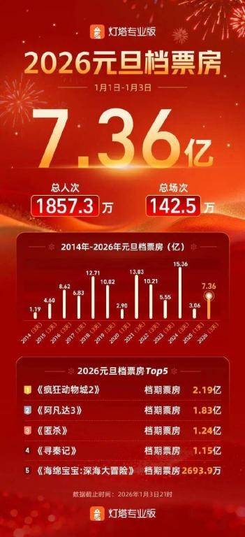 “请三休八”的拼假热潮下,2026年电影市场迎来开门红。国家电影专资办及灯塔专业版权威数据显示,元旦档(1月1日-1月3日)总票房最终收报7.39亿元,较2025年同期大幅增长141%,创下同期票房新纪录。
