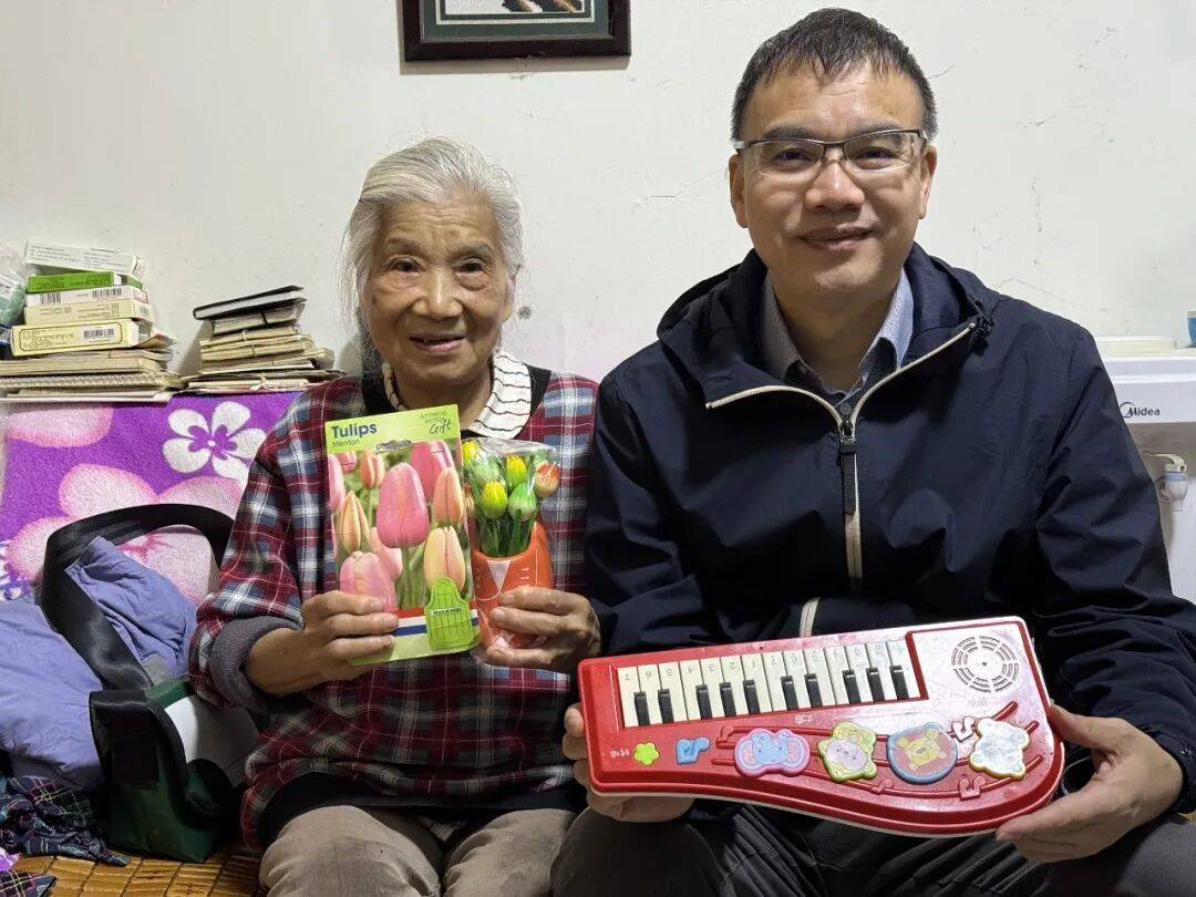 我们特地去看望了老太太,胡阿姨拿着她非常可爱的、捡到的小电子琴给我们弹《东方红》,然后我给她带了一份郁金香的种子。少斌还调侃老太太:你要成网红了,以后出去注意形象。