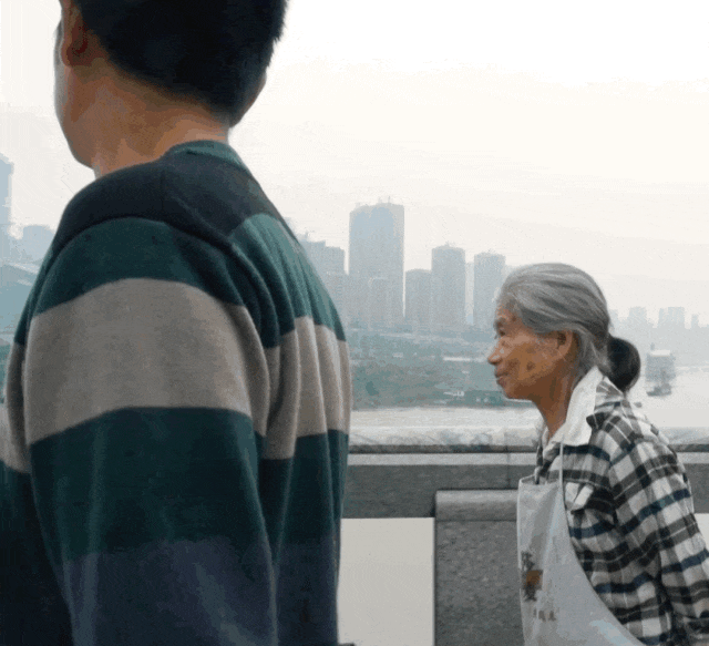 疫情期间,我又去到重庆,用航拍器补拍了一个格子间一般的公寓外景,作为结尾的镜头——在胡阿姨新家的窗口,那里有一片花。