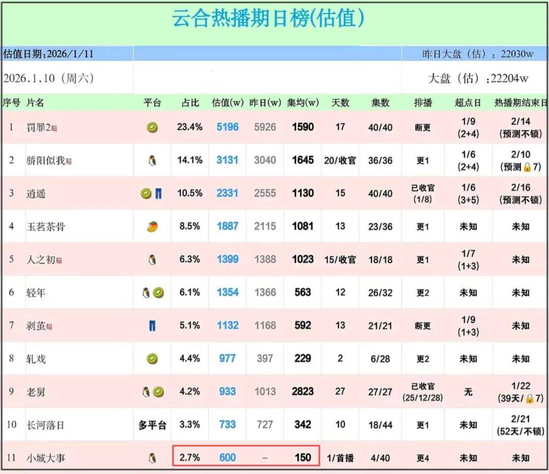 在网播成绩方面,《小城大事》全网播放量首日占比为2.7%,播放量估值600万,集均播放量150万,平台播放热度23191,开局不利。