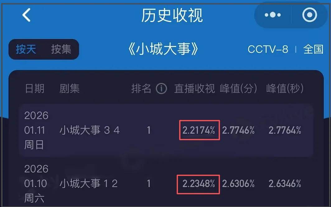收视率方面,《小城大事》高开低走,前两集整体收视呈上升趋势,后两集整体收视不升反降,最新一集的收视峰值数据甚至不如第一集。从这两天的整体收视对比能够看到收视走势明显疲软,剧情没能留住观众。