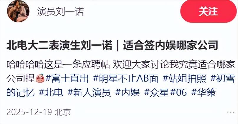 还有网友注意到,她上个月还在网上为签公司的问题烦恼,在线求工作,平常社交平台发的多条动态,也都是在给自己做推广宣传的,看样子完全就是没背景糊糊小演员,不像真正的白富美。