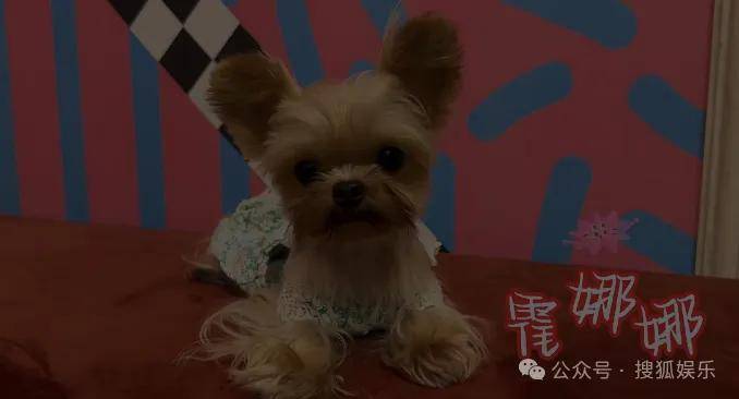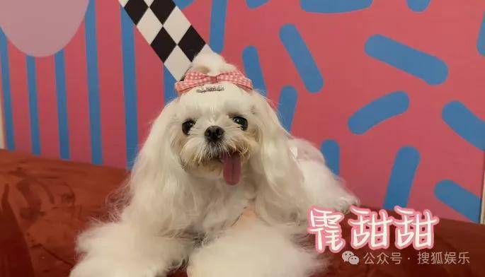 狗狗吐着舌头,头上戴着红色蝴蝶结,一整个小公主。霍思燕喜欢的不得了,直接抱着猛吸。