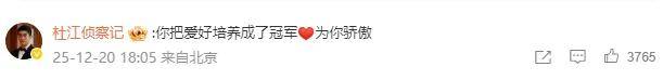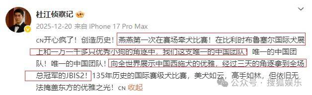 2025年12月20日,杜江曾激动发文称,在比利时布鲁塞尔国际犬展上,霍思燕团队作为唯一的中国团队,经过三天角逐,拿到全场总冠军的JBIS2。