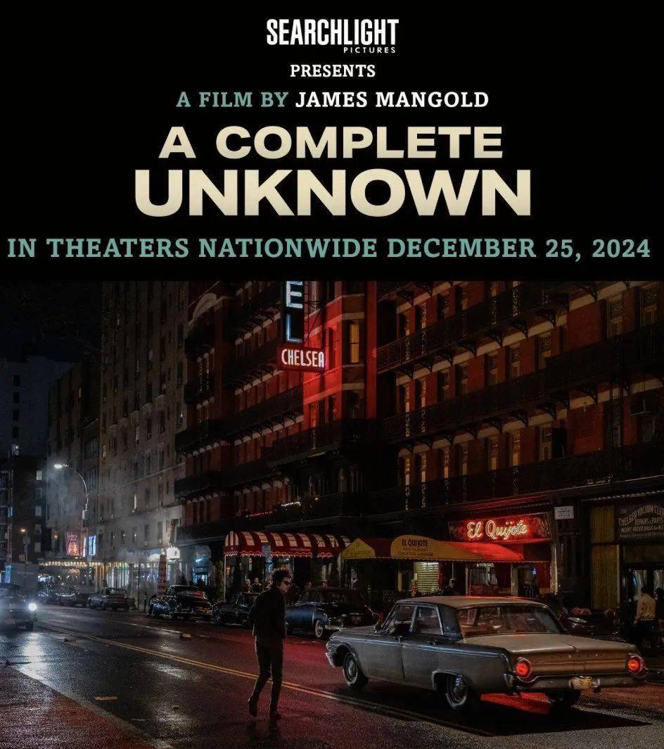 提莫西·查拉梅主演的鲍勃·迪伦传记片《完全未知》定档,将于今年12月25日北美、明年1月27日英国上映。该片由詹姆斯·曼高德执导,杰伊·考克斯编剧,提莫西·查拉梅饰演迪伦,艾丽·范宁饰演迪伦在1960年代初期的恋人、大学生兼艺术家西尔维·罗素,爱德华·诺顿饰演著名民谣歌手、活动家皮特·西格。故事聚焦1965年,年轻的迪伦首次用电吉他表演,撼动了音乐界。