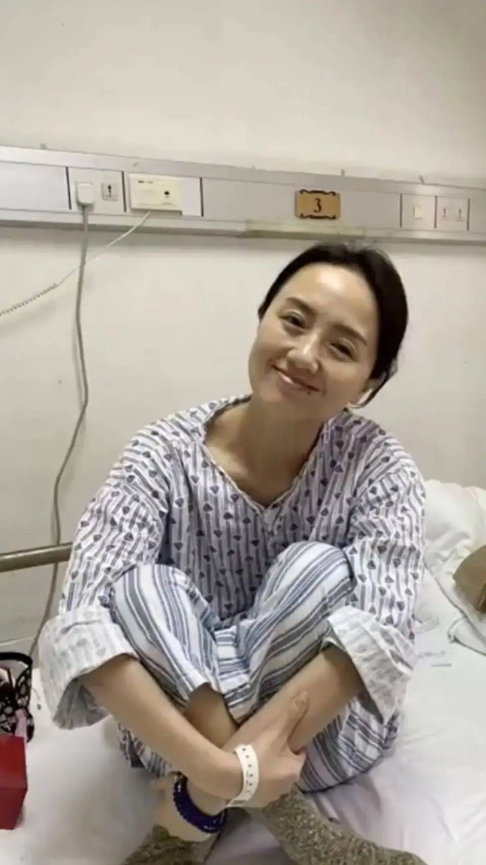 她穿着病号服,挽着头发、对着镜头露出很从容的笑容。虽然已经很瘦了,但看着还挺有精神的。