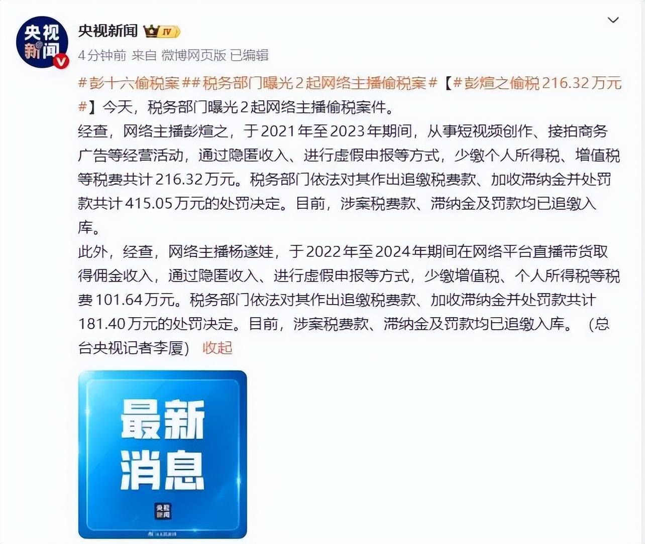 税务部门通报,彭十六(本名彭煊之)在2021-2023年通过隐匿短视频创作收入、商务广告收益(单条1分钟视频报价55万元)及虚假申报,少缴税费216.32万元,被追缴税款、滞纳金及罚款合计415.05万元,定性为劣迹艺人全网禁。她的个人账户三年累计收款905万元,与纳税额严重不匹配。