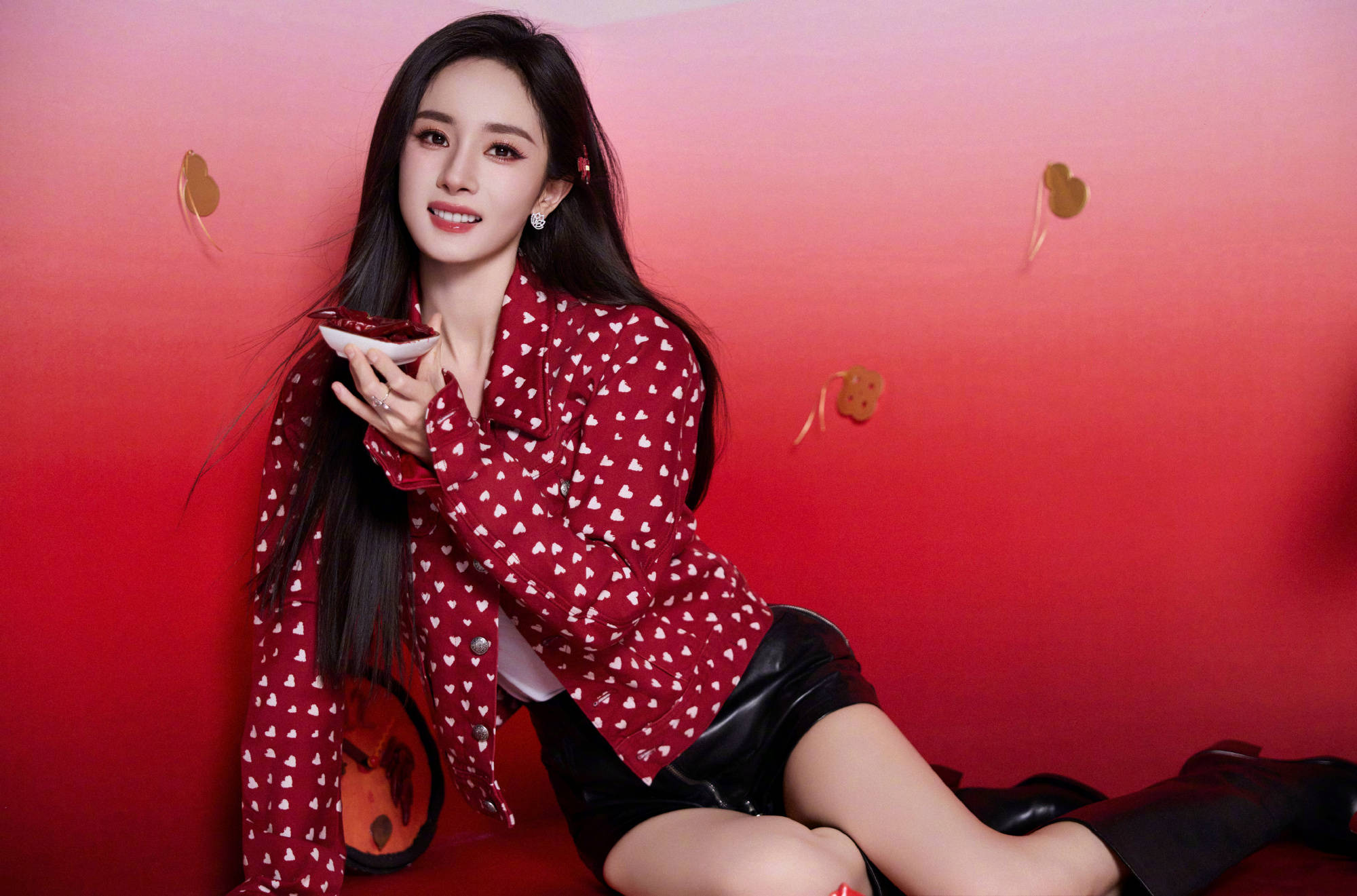 杨幂穿红白爱心波点夹克好养眼。