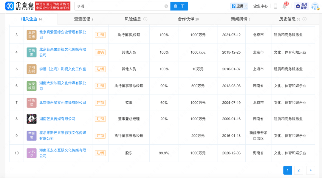 据企查查信息显示,李湘名下超10家公司已为注销状态,包括李湘(上海)影视文化工作室、湖南芒果传媒有限公司等,行业涉及租赁和商务服务业、文化、体育和娱乐业,李湘多担任股东、执行董事、总经理等身份。