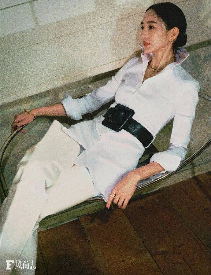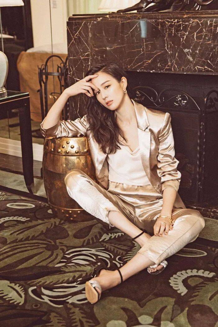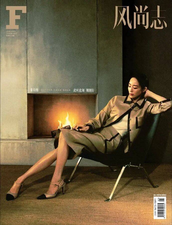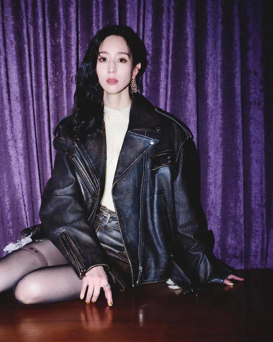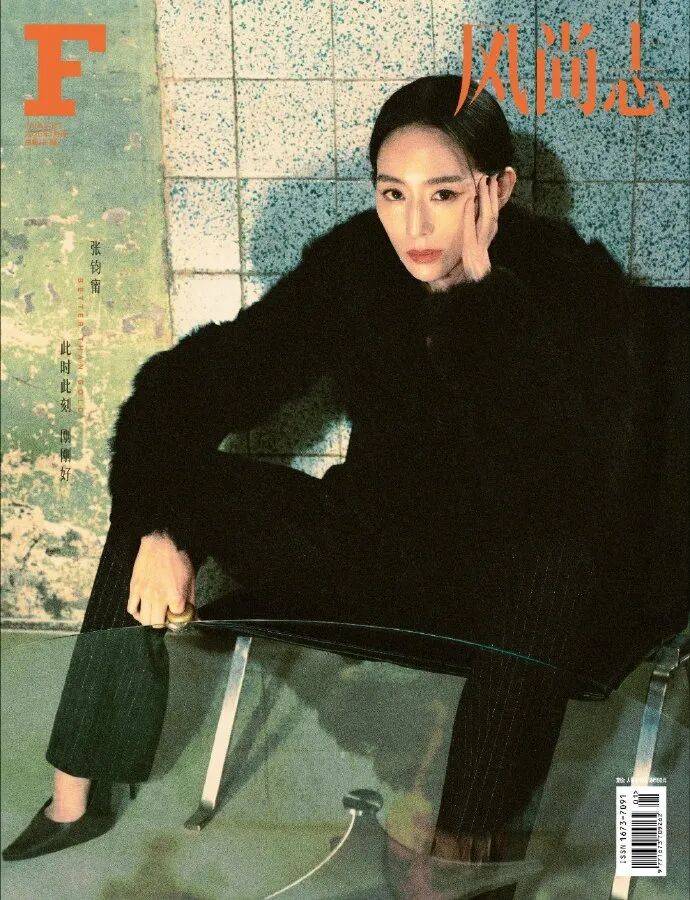 在《风尚志》封面中,张钧甯身着黑色丝绒皮衣与波点黑丝,通过高腰短裤设计、塞衣角技巧及尖头高跟鞋的搭配,视觉上拉长腿部比例,形成“胸以下全是腿”的惊艳效果。
