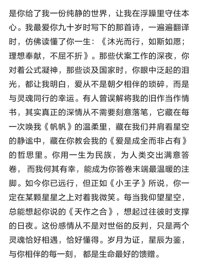 她也是再度发文,怀念了杨先生,并且还明确表示称-我走向杨先生,不是奔向锦衣玉食,也不是图一份安逸,而是把灵魂安放在更高的坐标