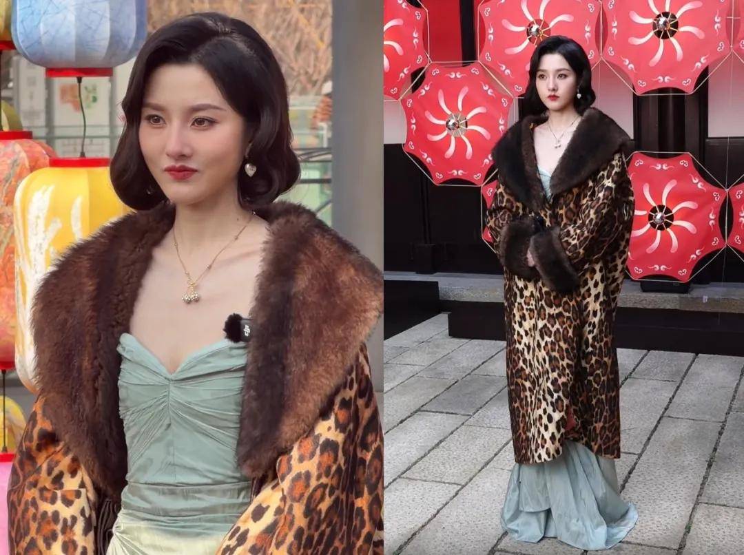 宋祖儿穿了一条浅绿色抹胸长裙,搭配一头复古的短发和毛领豹纹外套,让人幻视影视剧里那些心狠手辣的反派或者大佬身边的女人。