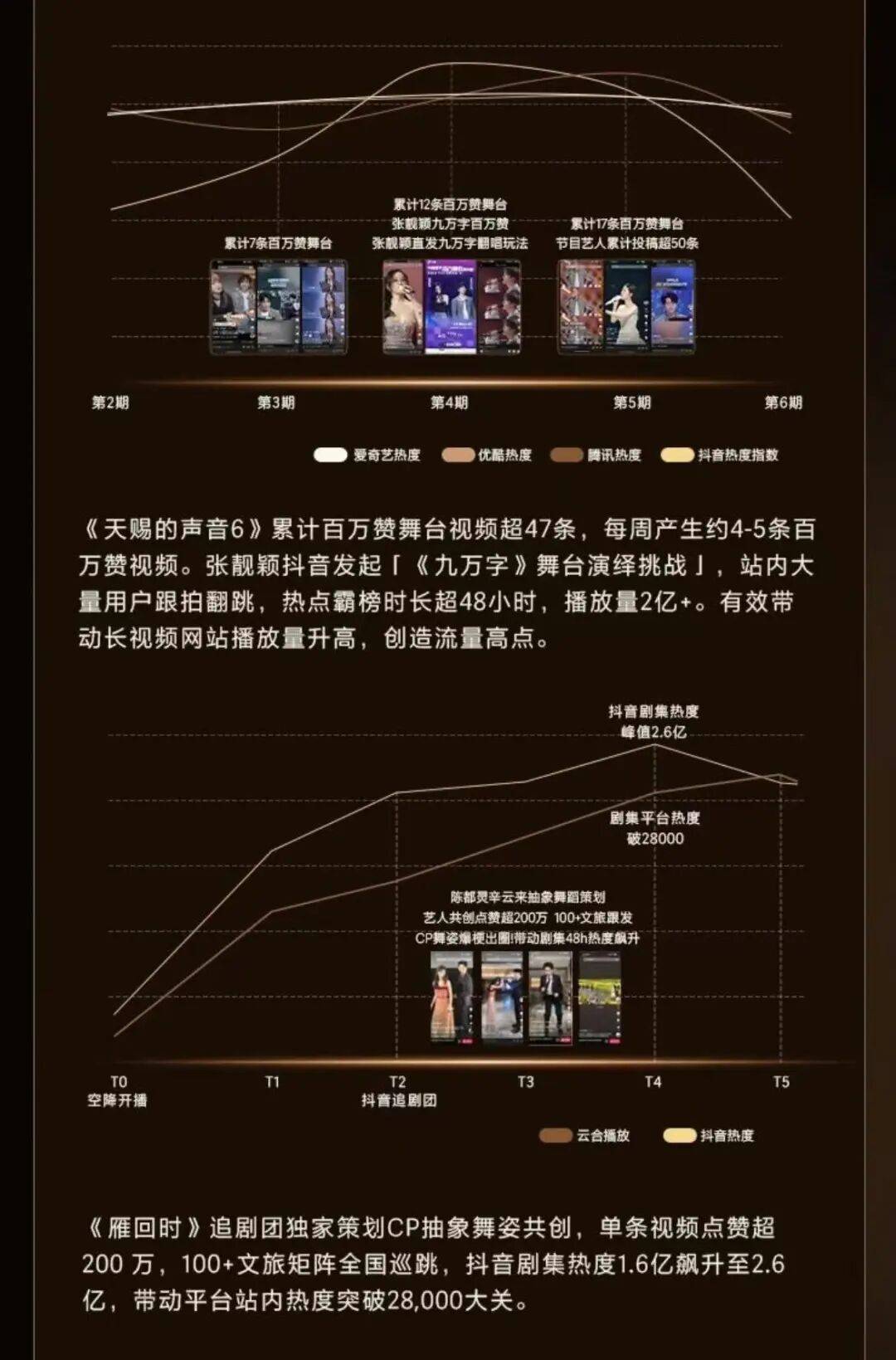 《天赐的声音6》播出期间,张靓颖抖音发起「《九万字》舞台演绎挑战」,站内大量用户跟拍翻跳,热点霸榜时长超48小时;从而带动长视频热度走势持续增长。《雁回时》追剧团独家策划CP抽象舞姿共创,也带动其站内热度突破了28000大关。