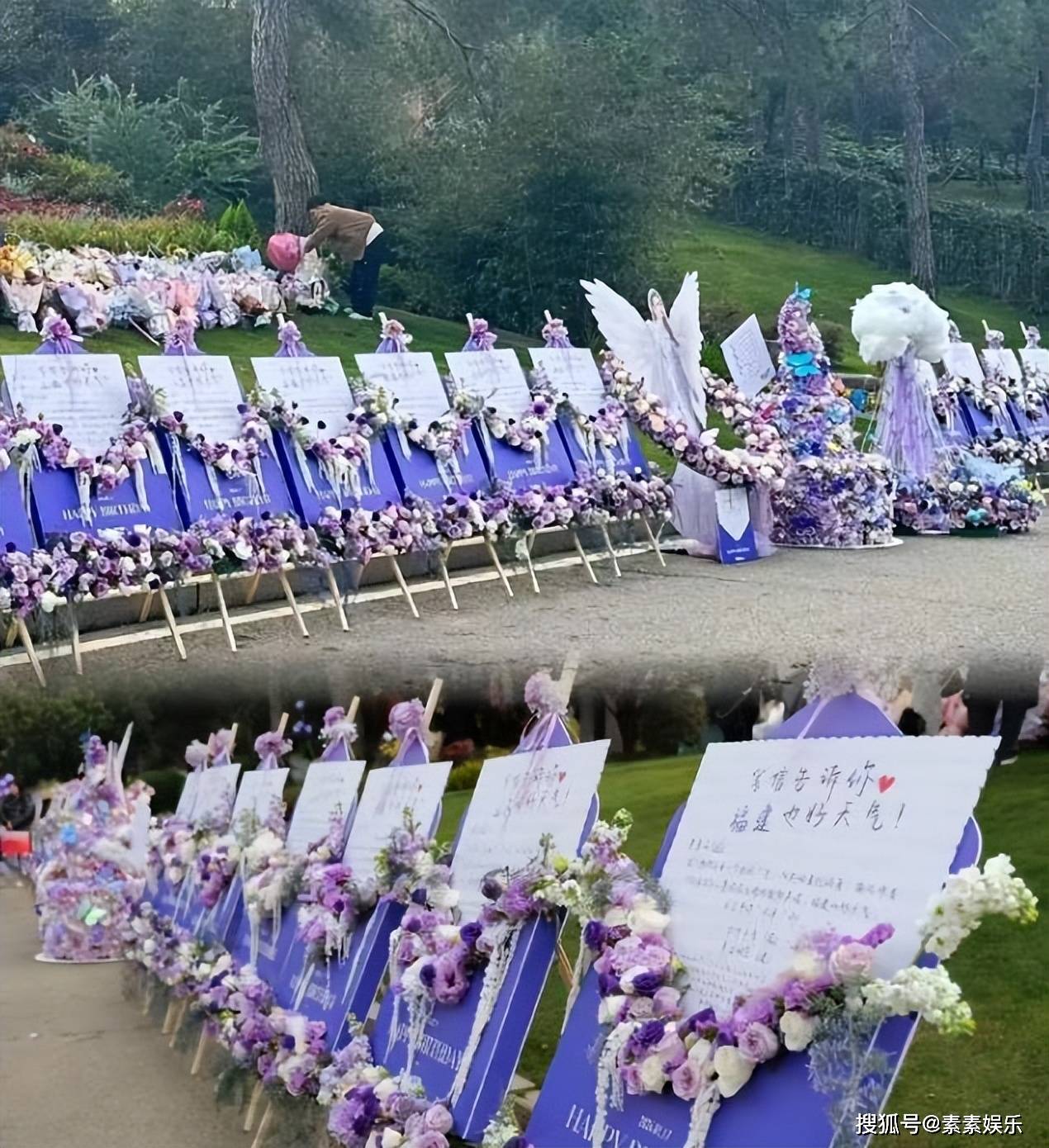 紫色蓝色的鲜花,气球,还有生日蛋糕,粉丝们的精心布置与细心举动,一定可以让天后李玟在满满的爱中被守护着。