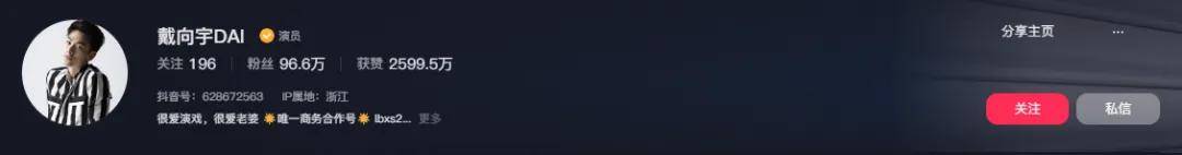 戴向宇的短视频平台简介上也清楚的写着,“很爱演戏,很爱老婆”