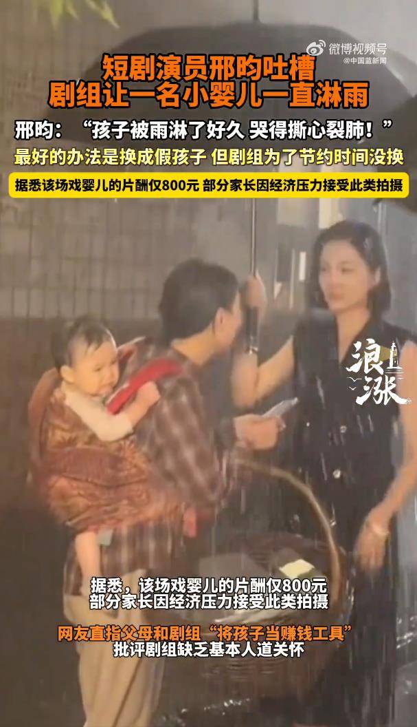 据1月18日报道,1月17日,一则来自短剧演员的实名爆料,在寒冬里点燃了公众的怒火。演员邢昀揭露,某剧组在深夜拍摄雨戏时,竟让一个真实的婴儿在人工制造的“瓢泼大雨”中,持续淋了近半小时。消息一出,瞬间将野蛮生长的短剧行业推上了拷问良心的审判席。