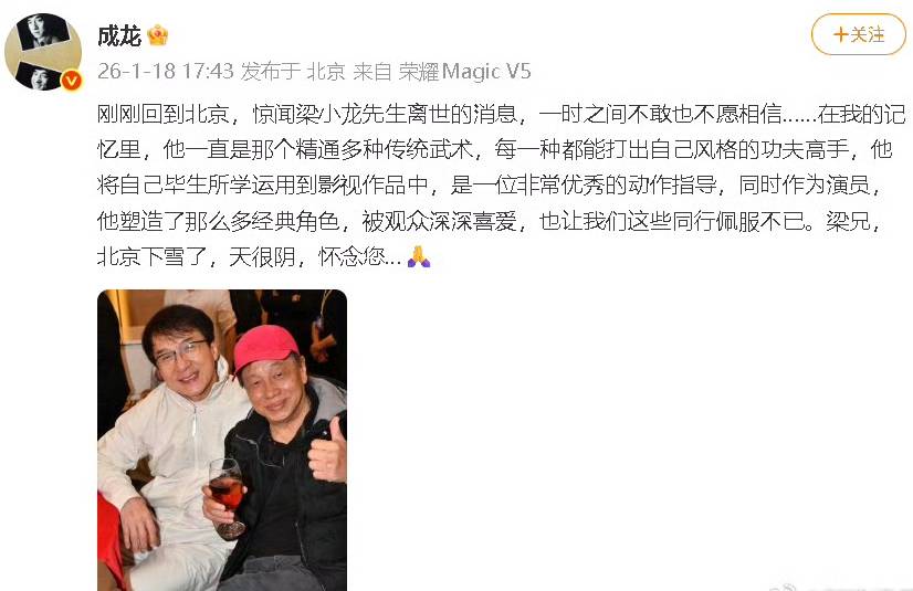 成龙则低声轻诉着:北京下雪了,天很阴,怀念您……我一时之间不敢也不愿相信。