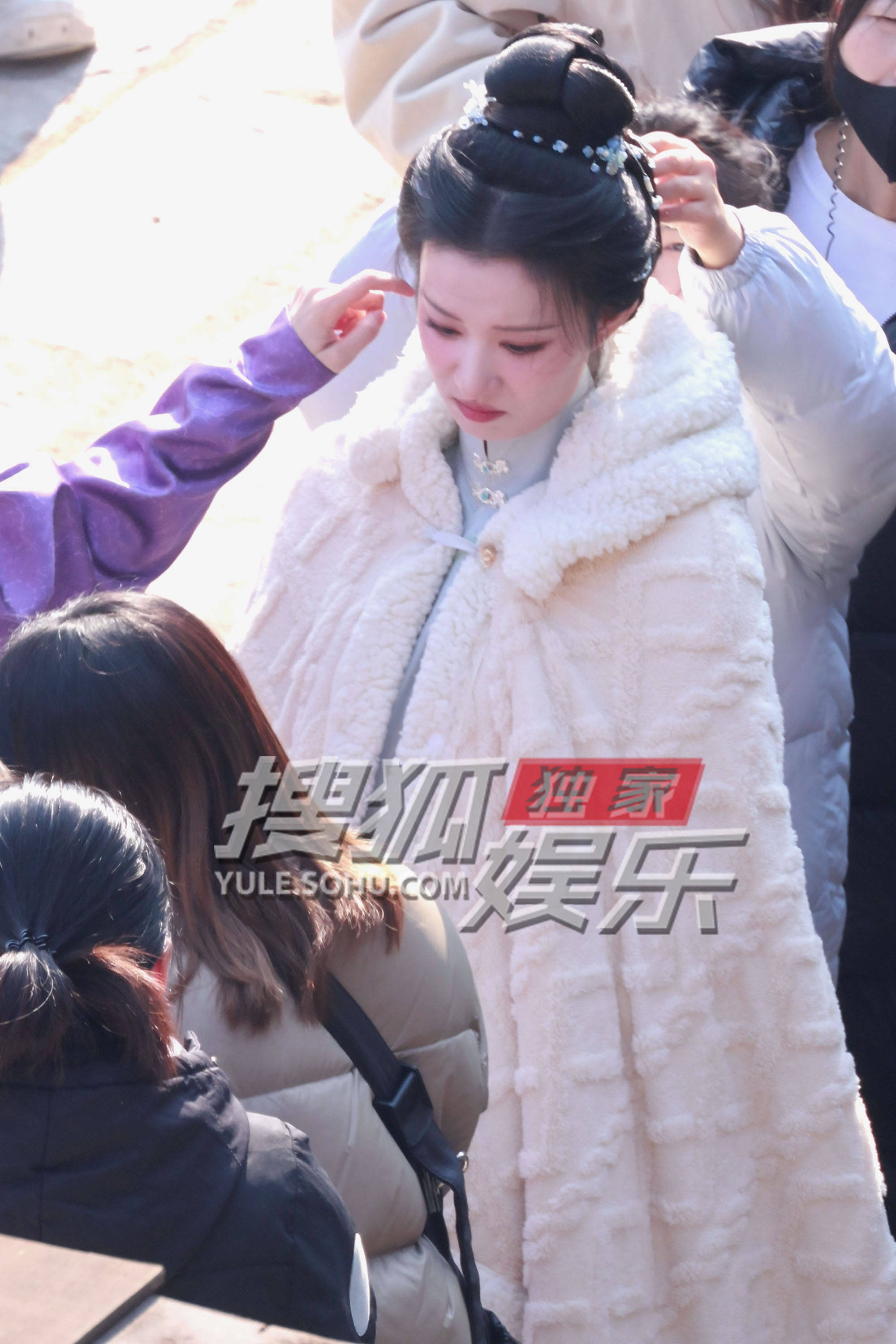王楚然穿着白色毛绒斗篷,扎着高高的发髻,特别温婉可人。