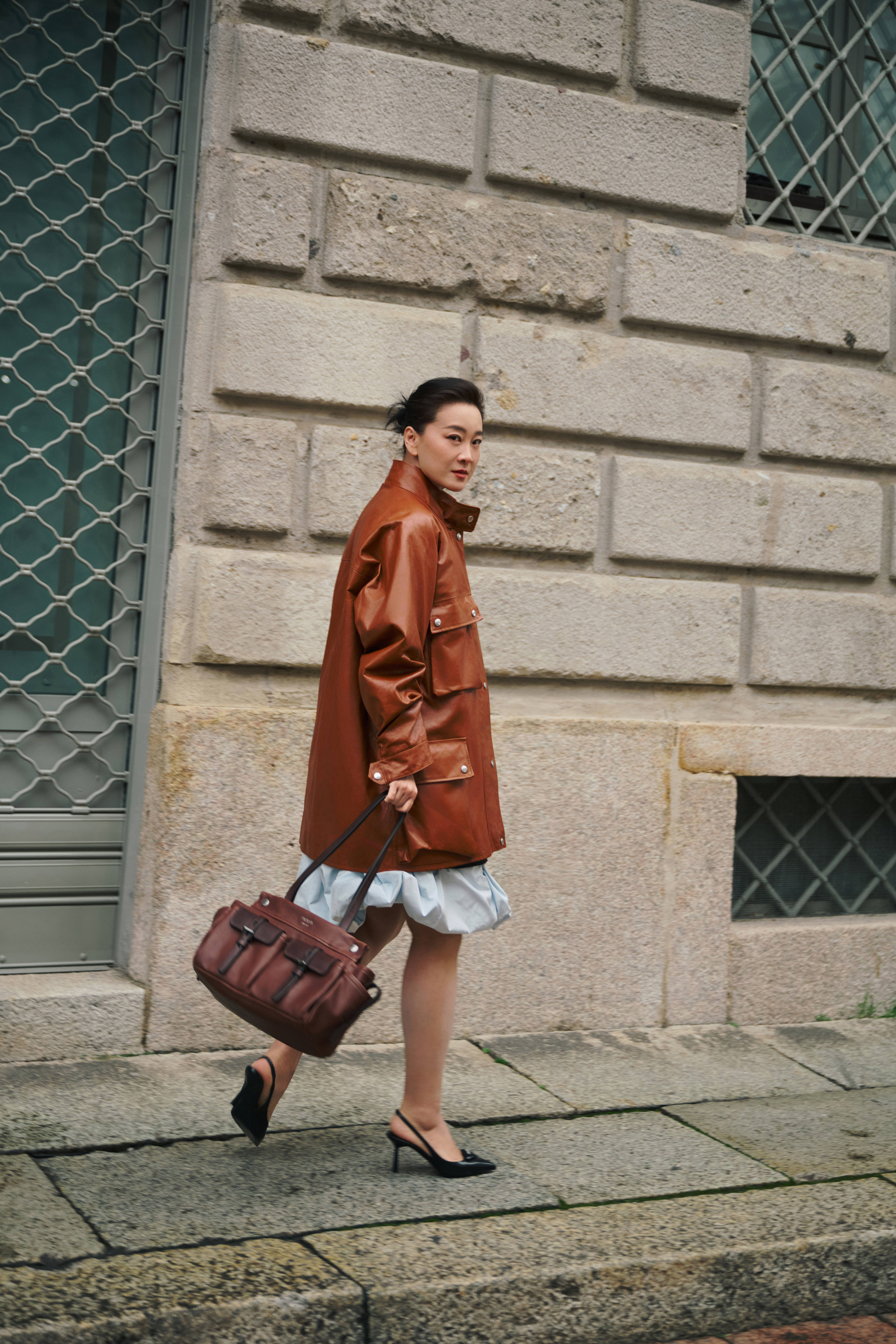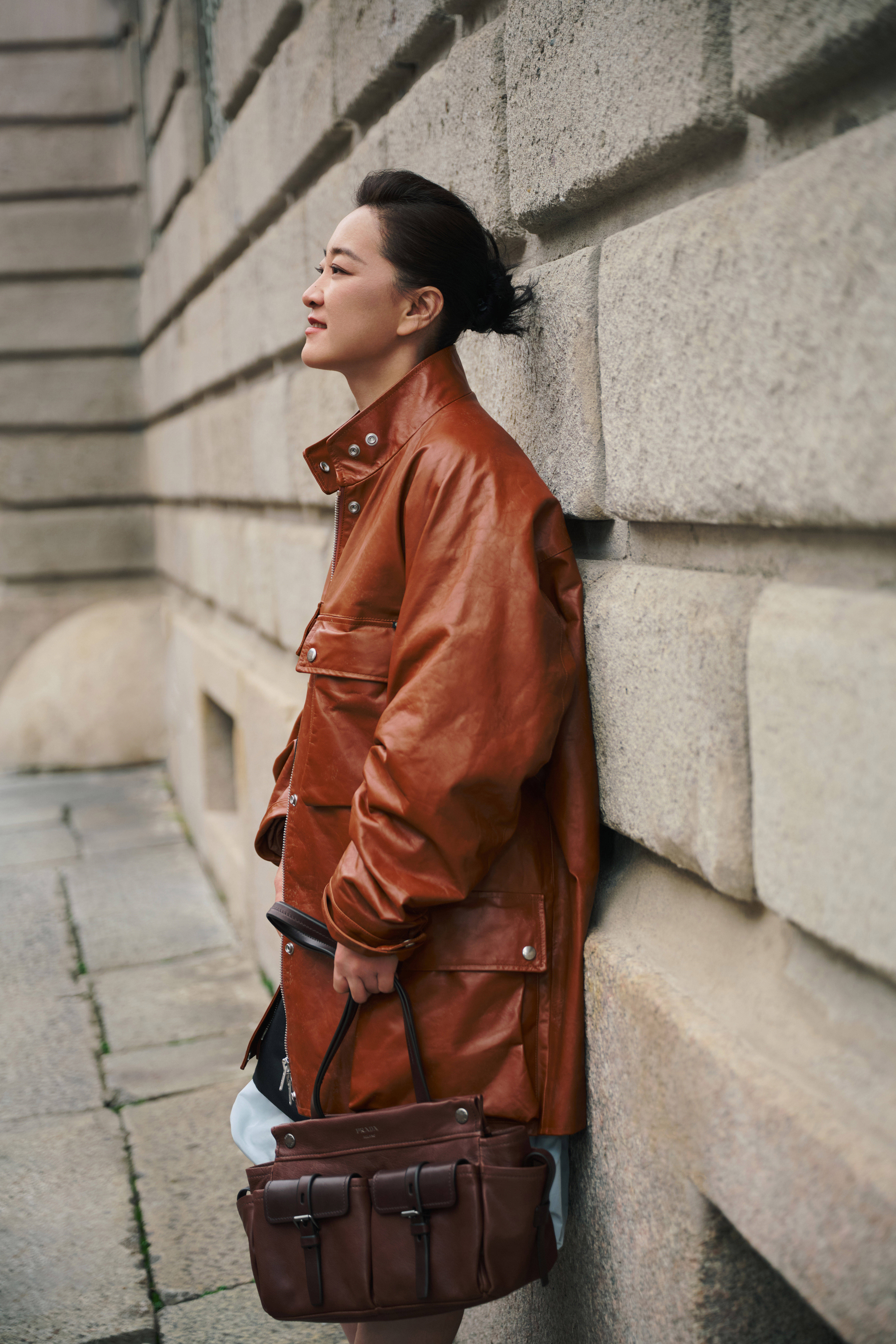 搜狐娱乐讯 近日,贾玲亮相米兰时装周美图释出。图中,她棕色皮衣搭配浅蓝裙摆混搭感十足,松弛又随性。