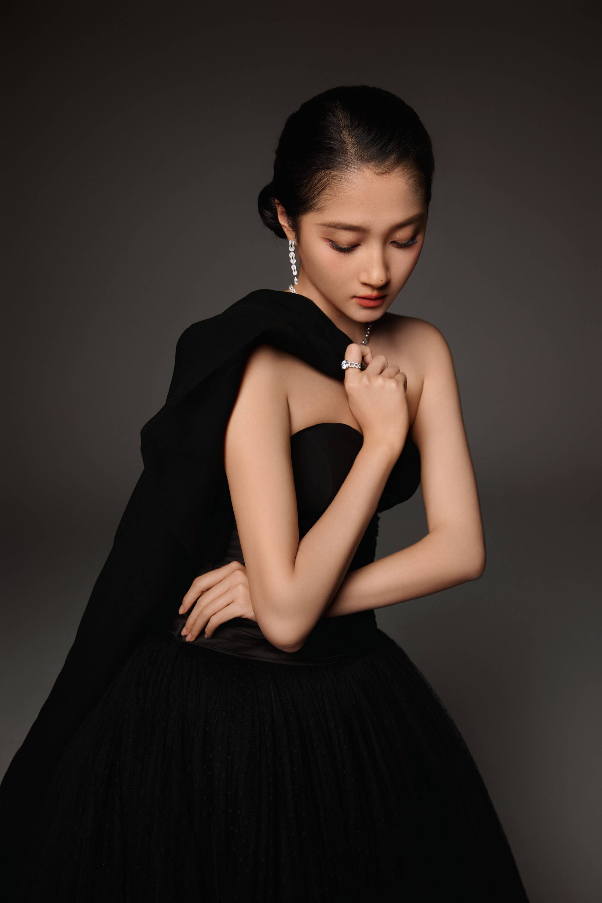 关晓彤着抹胸黑裙搭黑披肩,慵懒又贵气。
