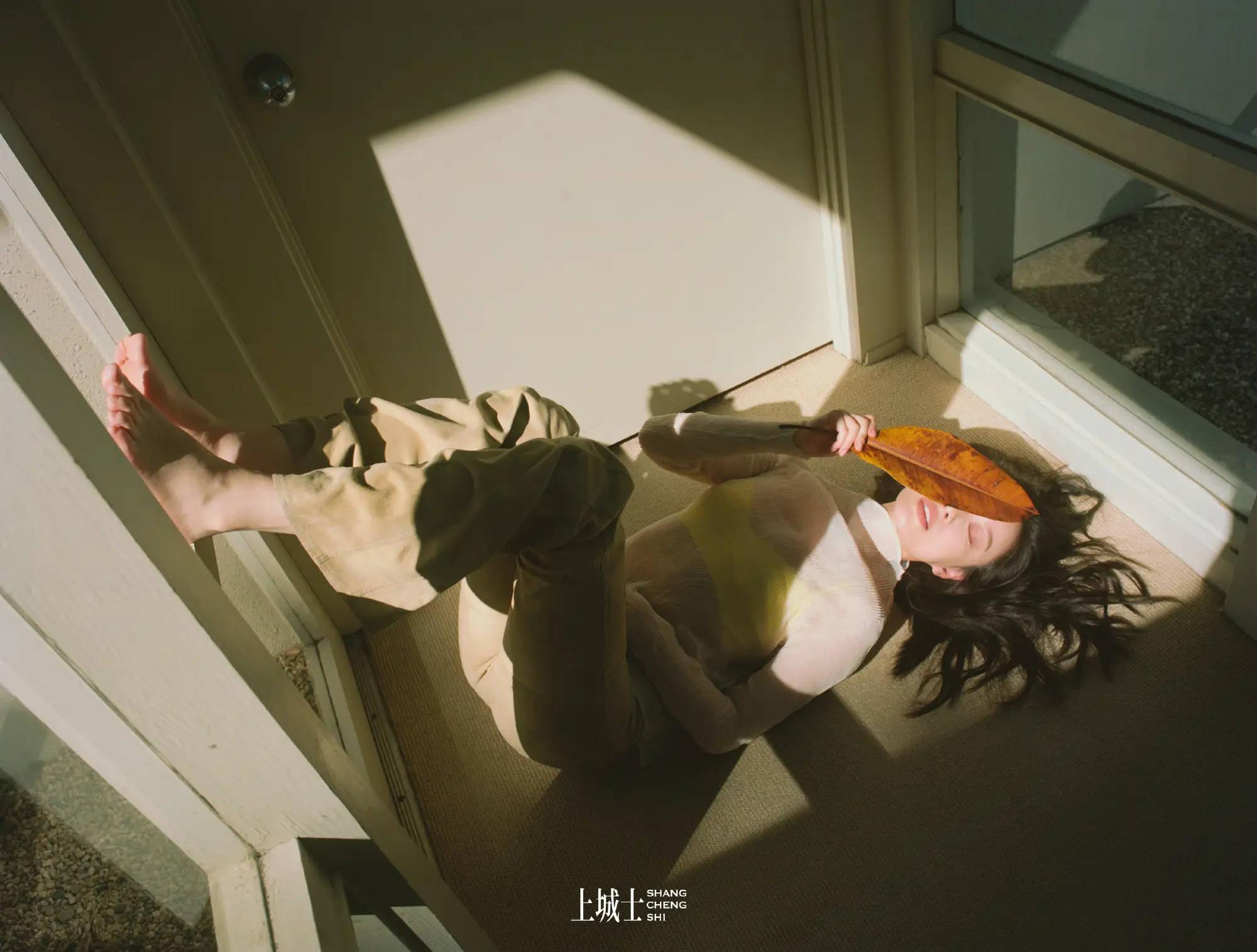 倪妮用叶子挡住脸庞,感受着南加州温热的阳光。