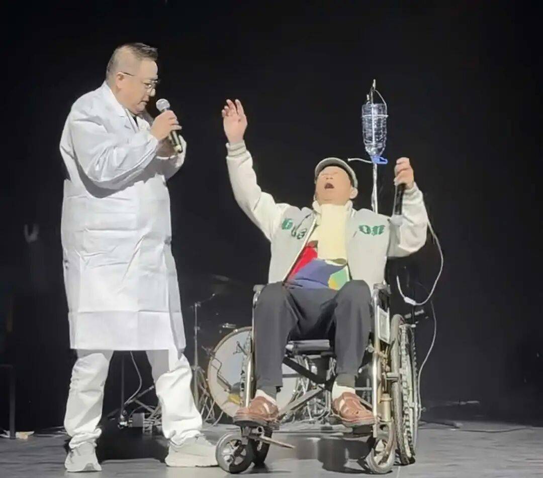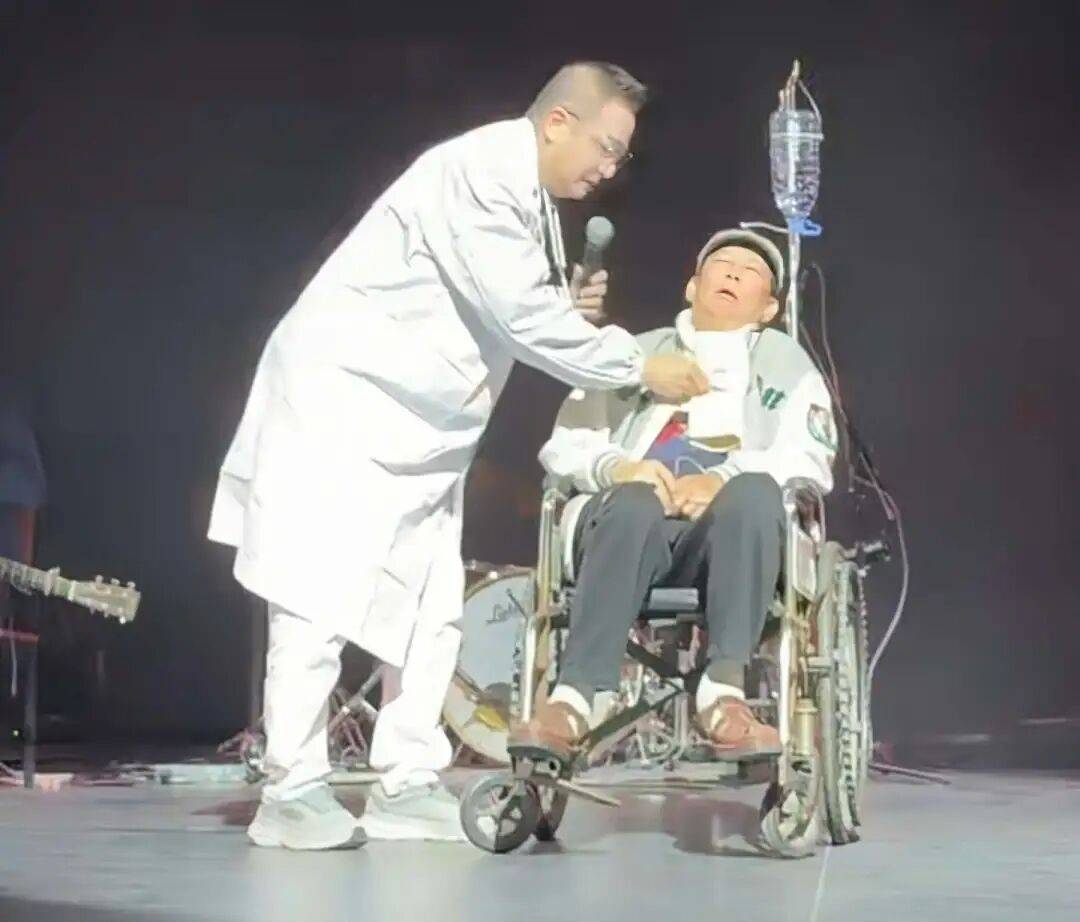 从视频中可以看到,黎彼得在台上坐着轮椅,整个人看起来非常虚弱,最惹人关注的,还是他的手上竟然还在输液,一看就是带病演出。