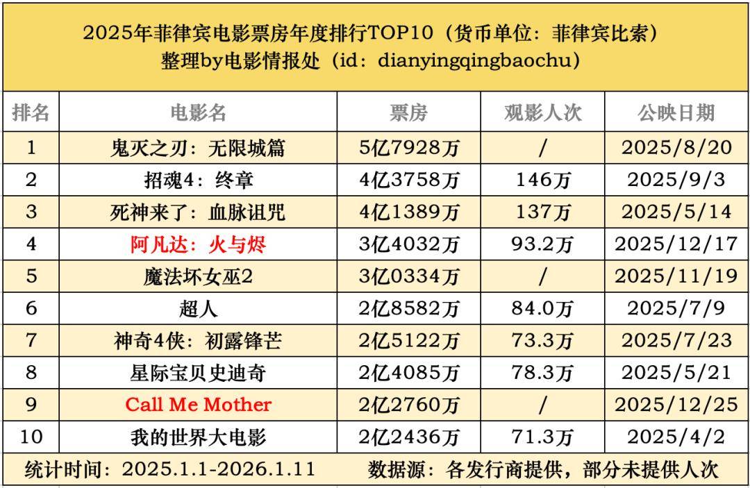 下面情报君将列出全球前20大市场和5个受关注亚洲市场的票房榜单并对市场情况做出简单介绍,表格中红色字体代表该电影尚在映中,加粗字体代表这是本土电影,数据统计截至2026年1月11日。部分市场由于正式数据尚未发布,采用电子计票或其他临时替代数据。此外北美、英国及爱尔兰和印度三个市场的观影人次数字以及法国票房数字由分析机构估算而非统计值。完整版的2025全球电影市场报告我们预计会在今年3-4月推出,有深度合作意向的公司可以后台私信。