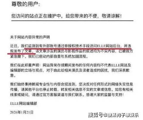 “有外部账号通过非授权技术手段访问ELLE后台,并违规发布了文章。该文章涉及的演员与影视作品的叙述均为不实内容,已被我方紧急撤下。”