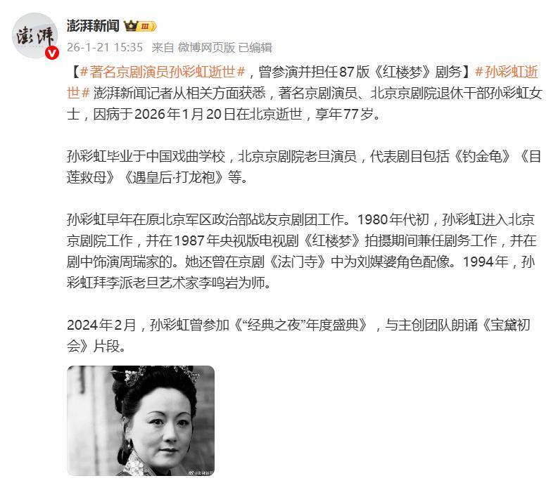 据1月21日报道,1月20日凌晨,一则消息让无数“红楼迷”心头一沉。著名京剧演员、87版电视剧《红楼梦》中“周瑞家的”扮演者孙彩虹,因病在京逝世,享年77岁。遗体告别仪式已于1月22日举行。